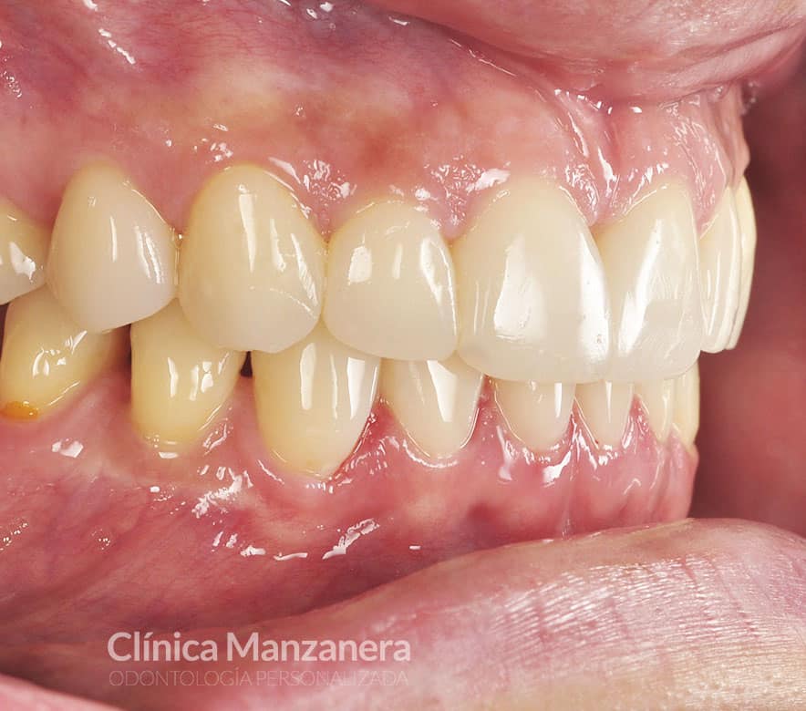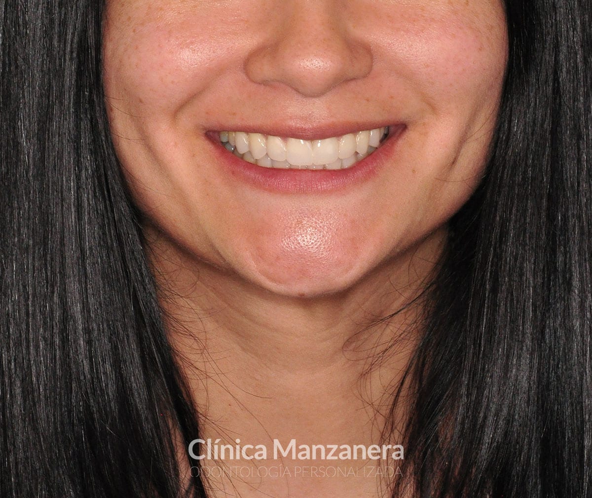 Se ve claramente como ha mejorado la proyección de los labios, la inclinación de los dientes y la estética. La sonrisa se rellena mucho más toda la arcada, queda más expandida y no se ve una arcada tan estrecha y con tantos triángulos negros.
